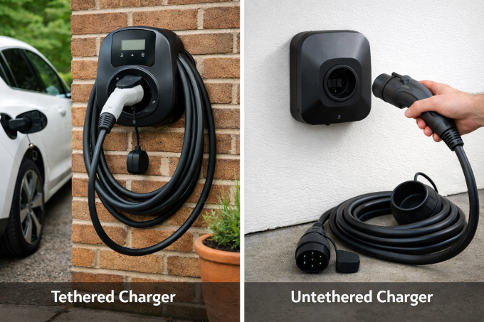 Tethered units are similar to petrol pumps, where the charging cable is permanently attached to the wall box.